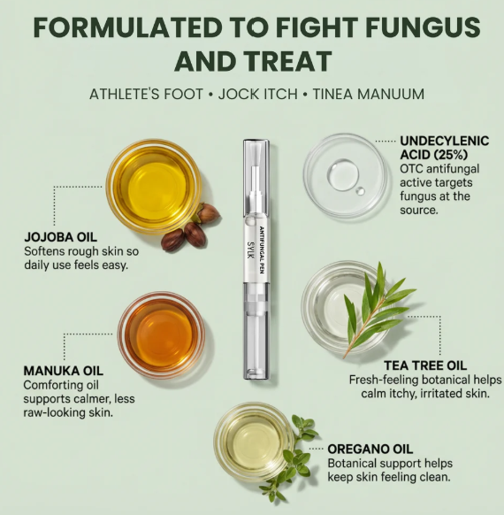 Answer 2: The formula contains 25% undecylenic acid, which is known for its antifungal properties, and is enhanced with natural ingredients like Tea Tree Oil and Oregano Oil, both of which are effective against fungal infections, helping to eliminate them and soothe irritated skin.